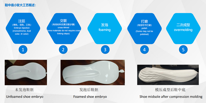 超临界小发大工艺流程为:注胚、交联、发泡、打磨、二次模压。