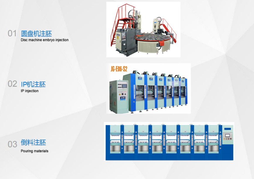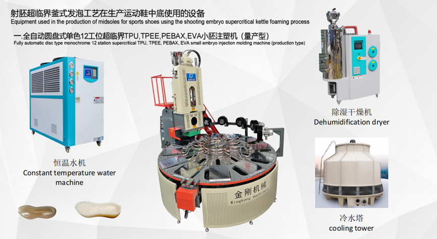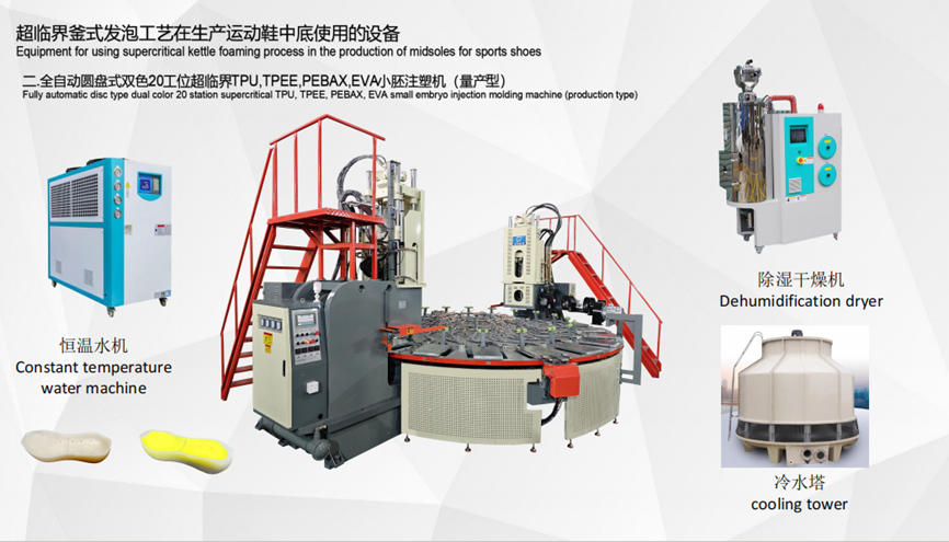 具体产品涵盖单色、双色、三色等各类超临界发泡鞋胚注塑成型机,适用于鞋材领域超临界发泡工艺需求。以及传统圆盘注塑机、橡胶色素成型机,以及针对PVC水鞋、TPU、TPR等材料的专用成型设备。