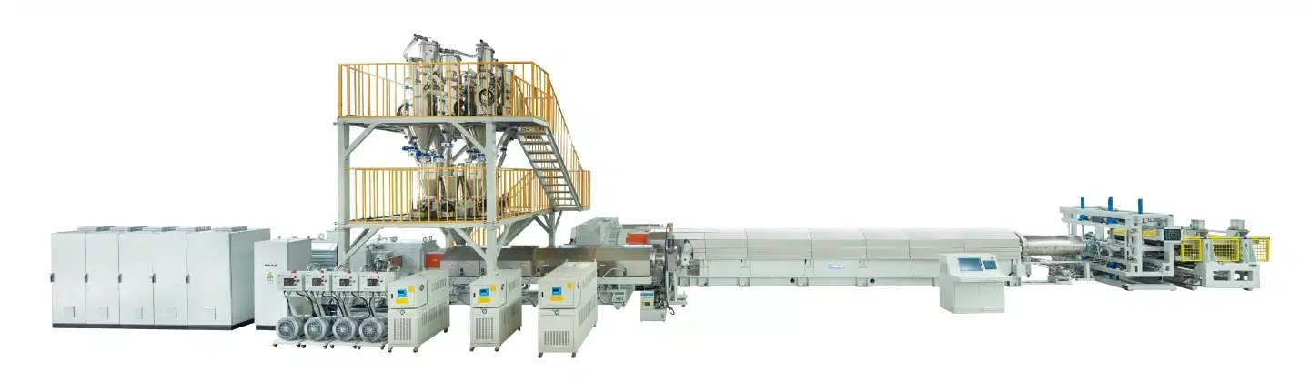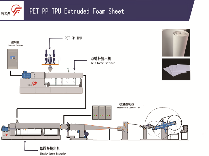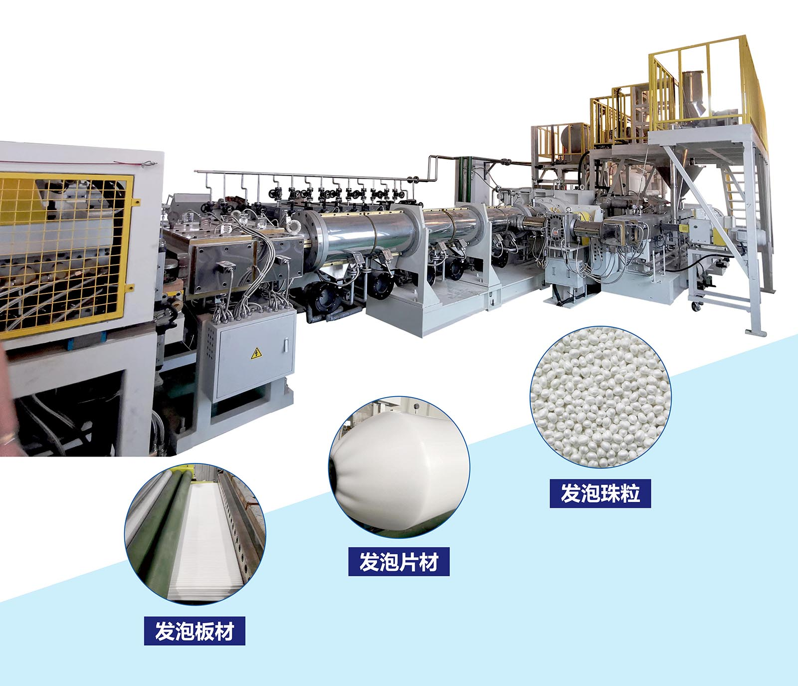 超临界发泡挤出设备包括XPS挤塑保温板材系列生产线(旗舰机型标准机型PET发泡板材生产线、TPU 超临界CO₂发泡挤出片材生产线PLA聚乳酸全降解发泡片材生产线